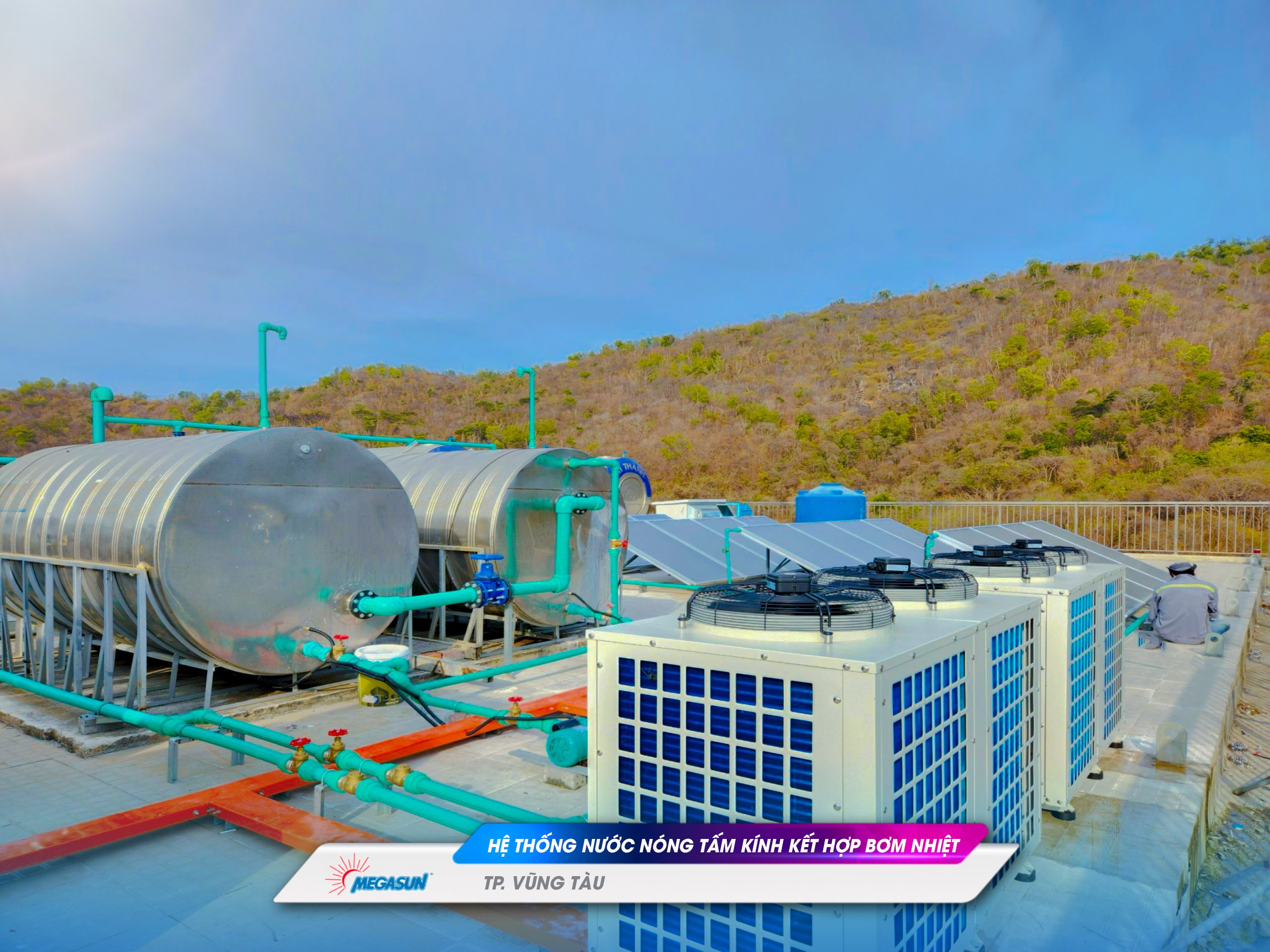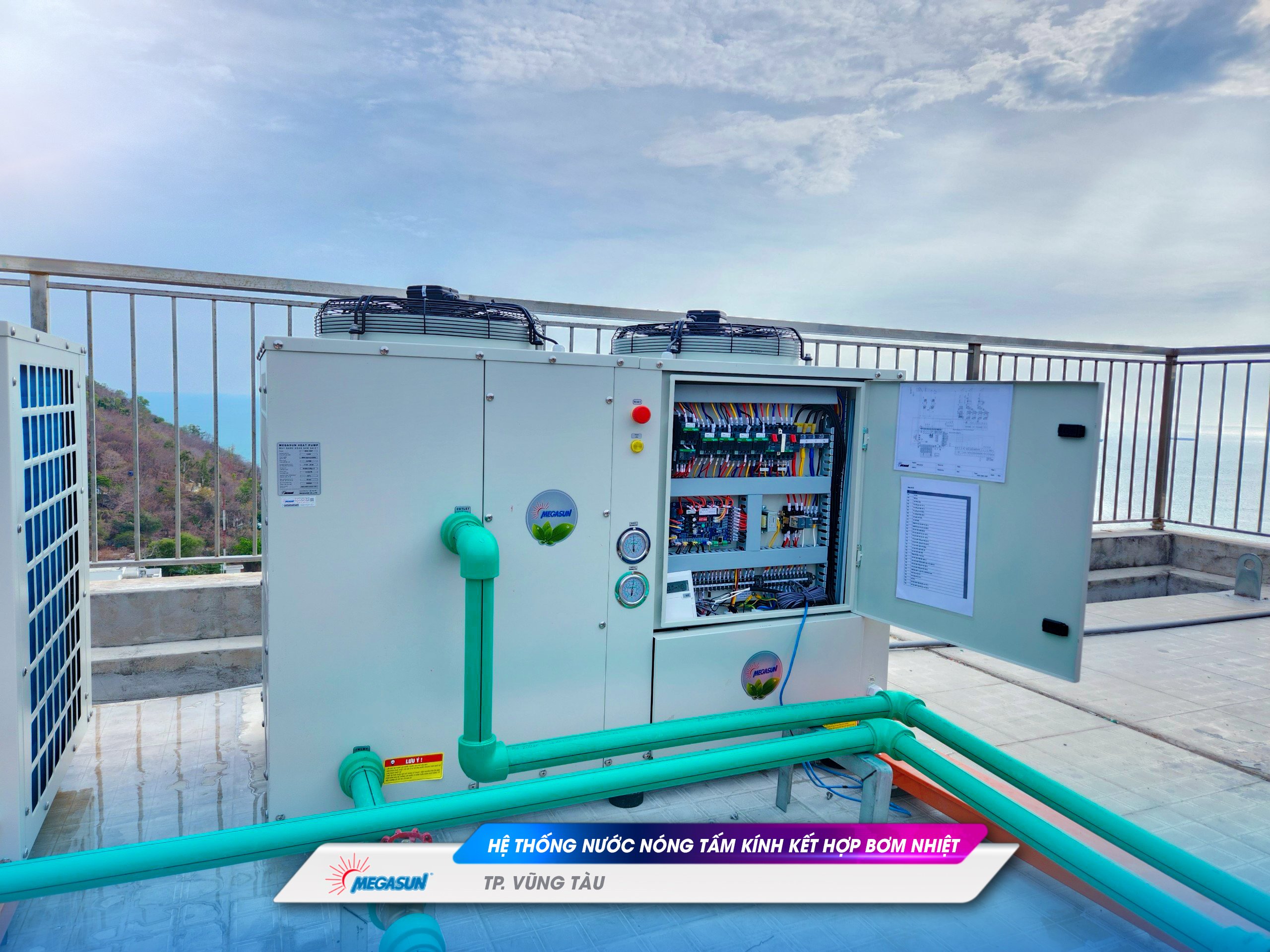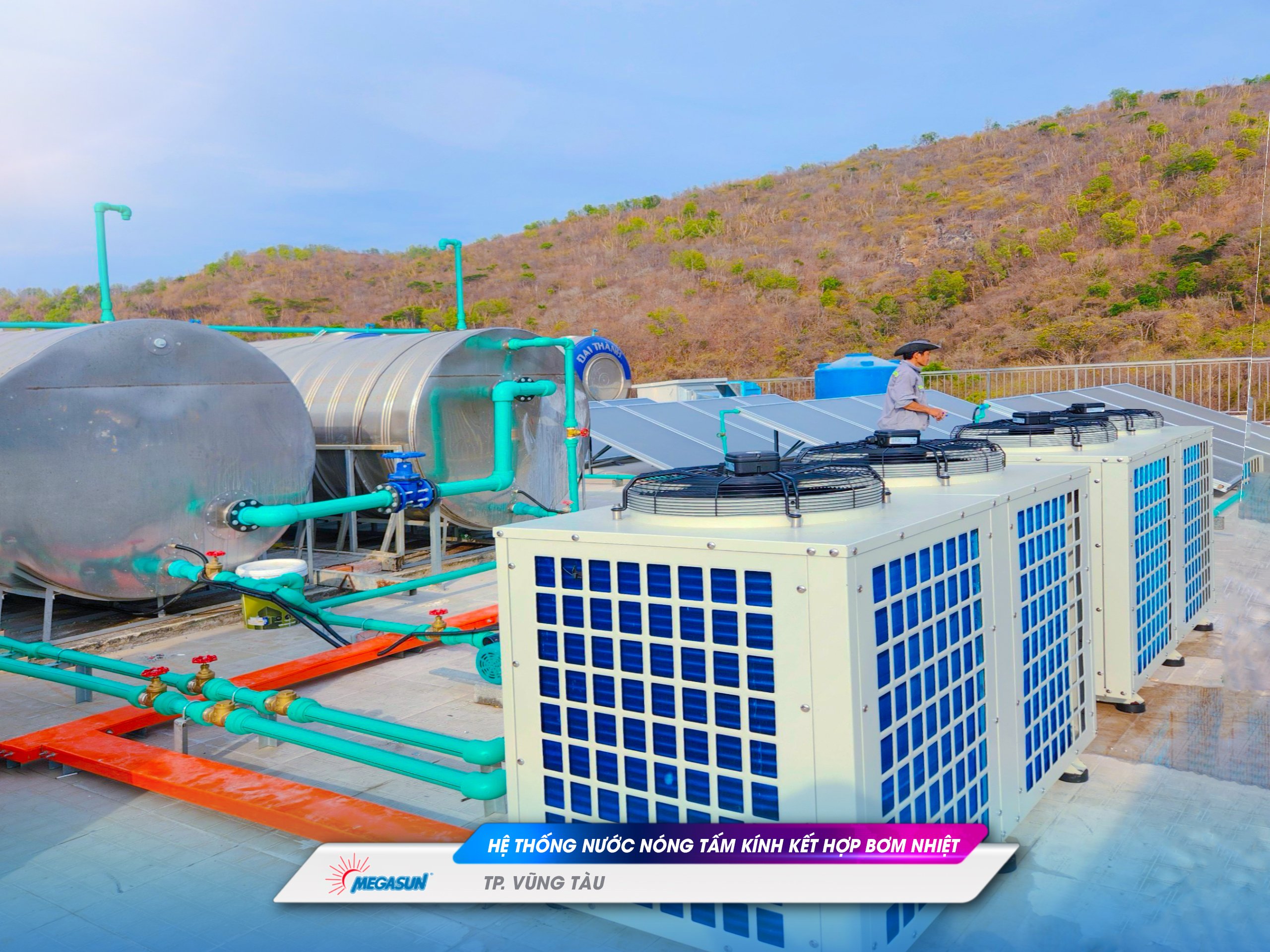 Hệ thống nước nóng năng lượng mặt trời kết hợp heat pump Megasun công suất 10,000 Lít. Hệ thống nước nóng tập trung cung cấp nước nóng 24/24, khách sạn sử dụng toàn bộ các thiết bị chính của Megasun bao gồm tấm phẳng thu nhiệt MGS-2500BLT : 16 tấm. 2 bồn bảo ôn giữ nhiệt 5000 Lít BBO-5000-KCAD, 2 máy bơm nhiệt heat pump MGS-10HP , tủ điện điều khiển hệ thống nước nóng tập trung của Megasun, mang lại sự tiện nghi cho khách sạn