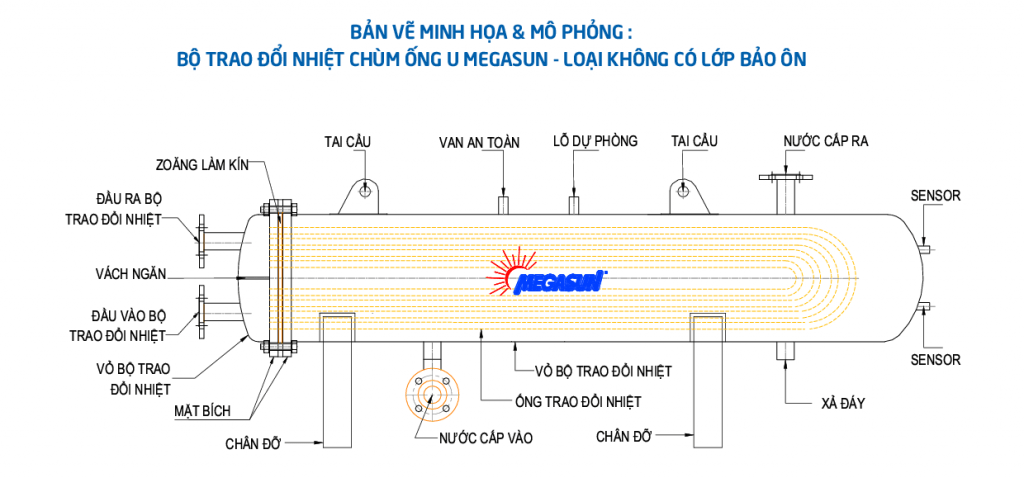 Bộ trao nhiệt chùm ống U Megasun không có bảo ôn – Sản phẩm sau khi xuất xưởng sẽ được thực hiện bọc bảo ôn tại dự án