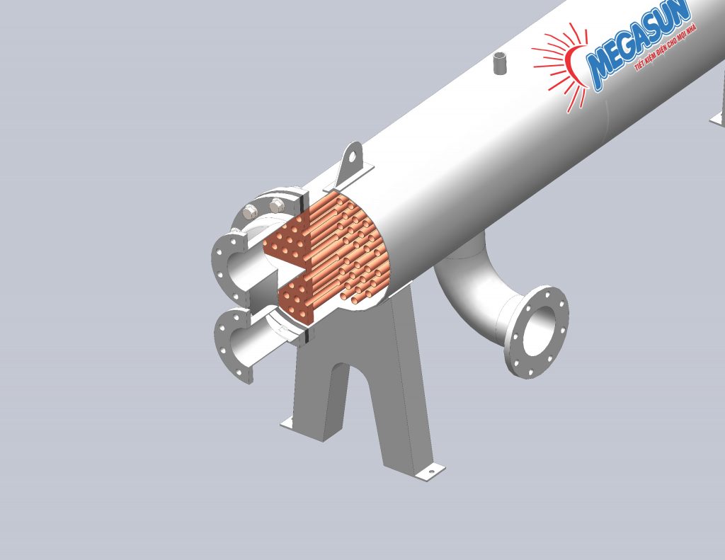- Trong hệ thống sản xuất nước: Trong sản xuất nước nóng bằng năng lượng mặt trời hoặc heat pump – Bộ trao đổi nhiệt dạng ống chùm Megasun được sử dụng để truyền nhiệt làm nóng nước ngành năng lượng, thiết bị này có thể được sử dụng trong các quá trình truyền nhiệt